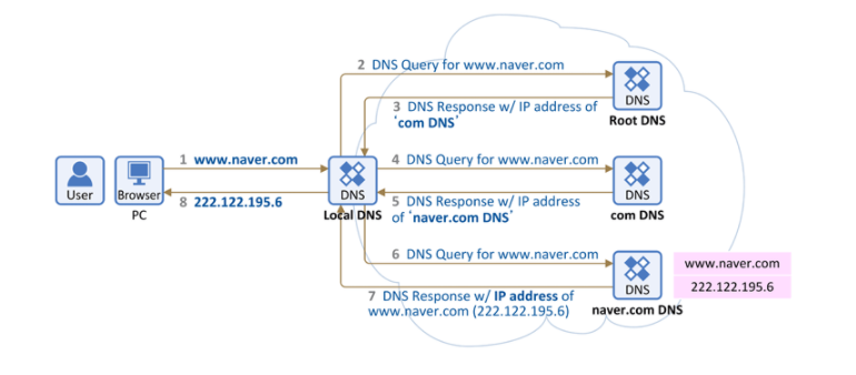 1. 웹 브라우저에 www.naver.com을 을 입력하면 먼저 Local DNS에게 "www.naver.com"이라는 "hostname"에 대한 IP 주소를 질의하여 IP 주소가 있을 수도 없을 수도 있다. 만약 있다면 Local DNS 가 바로 PC에 IP 주소를 주고 끝난다. Local DNS에 없으면 다른 DNS name 서버 정보를 받는다.