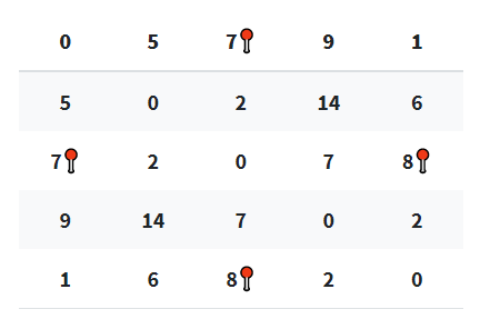 - 이런 과정으로 5번 노드를 중간 노드로 선정하는 라운드까지 모두 거치면 행렬에는 모든 노드 간 최단 거리가 들어가게 된다.